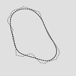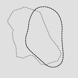FitPathToPath run on the sample paths with inIterations = 5, inFirstShift = 10, inFirstRotation = 10. The inReferencePath plotted in grey, the inPath/outPath in black.