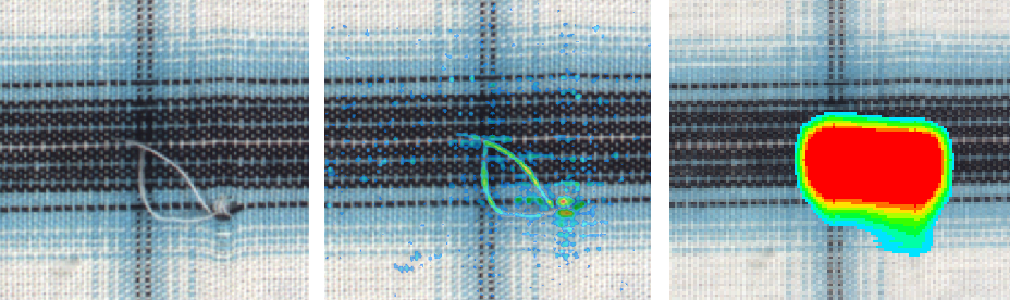 Left: The original image with a defect. Middle: An example of defect detection using DeepLearning_DetectAnomalies1. Right: An example of faster but less precise defect detection using DeepLearning_DetectAnomalies2.