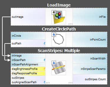 In each of the six filters the brightness profile is extracted in exactly the same way. The stripe of pixels along inScanPath of width inScanWidth is traversed and the pixel values across the path are accumulated to form one-dimensional profile. In the picture on the right the stripe of processed pixels is marked in orange, while inScanPath is marked in red.