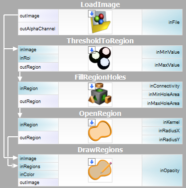 After a brief inspection of the input image we may note that the task at hand will not be trivial - the average brightness of the capsule body is similar to the intensity of the background. On the other hand the border of the capsule is consistently darker than the background. As it is the border of the object that bears significant information about its shape we may use the basic ThresholdToRegion filter to extract the darkest pixels of the image with the intention of filling the extracted capsule border during further refinement. The extracted region certainly requires such refinement - actually, there are two issues that need to be addressed. We need to fill the shape of the capsule and eliminate the thin horizontal stripes corresponding to the elements of the conveyor line setup. Fortunately, there are fairly straightforward solutions for both of these problems. FillRegionHoles will extend the region to include all pixels enclosed by present region pixels. After the region is filled all that remains is the removal of the thin conveyor lines using the classic OpenRegion filter. |