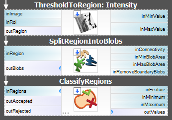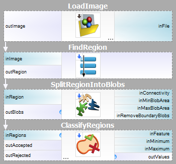 Having selected the numeric feature that will be used for the classification, we are ready to add the ClassifyRegions filter to our program and feed it with data. We pass the array of capsule blobs on its inRegions input and we select Rectangularity on the inFeature input. After brief interactive experimentation with the inMinimum threshold we may observe that setting the minimum rectangularity to 0.95 allows proper discrimination of correct (available at outAccepted) and deformed (outRejected) capsule blobs.