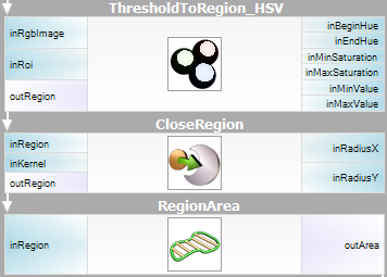 In this case each of the steps: Extraction, Refinement and Analysis is represented by a single filter. Extraction - to obtain a region corresponding to the red band a Color-based Thresholding technique is applied. The ThresholdToRegion_HSx filter is capable of finding the region of pixels of given color characteristics - in this case it is targeted to detect red pixels. Refinement - the problem of filling the gaps in the extracted region is a standard one. Classic solutions for it are the region morphology techniques. Here, the CloseRegion filter is used to fill the gaps. Analysis - finally, a single RegionArea filter is used to compute the area of the obtained region. |