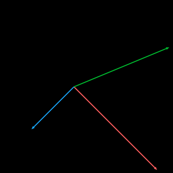 LerpVectors_Radial performed on two vectors: inVector1 DeltaX = 50, DeltaY = 50, inVector2 DeltaX = -25, DeltaY = 25, inRotationDirection = CounterClockwise, inLambda = 0,25. The green vector is the output vector.