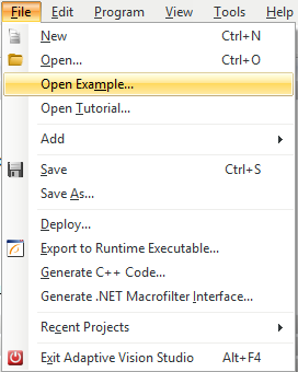 To open Program Example in Adaptive Vision Studio one should select File → Open Example... and choose from available projects.