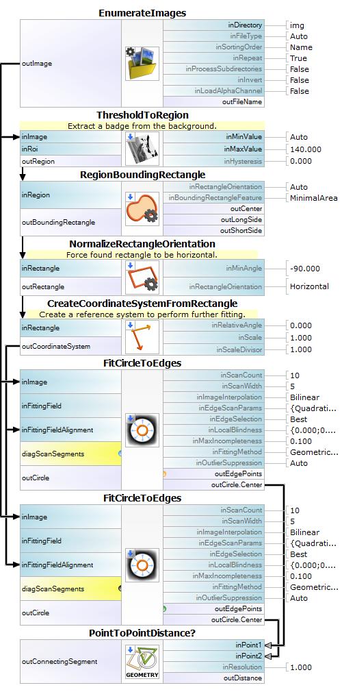 6. Add two FitCircleToEdges filters. Connect to it an input image and previously created CoordinateSystem2D from CreateCoordinateSystemFromRectangle.