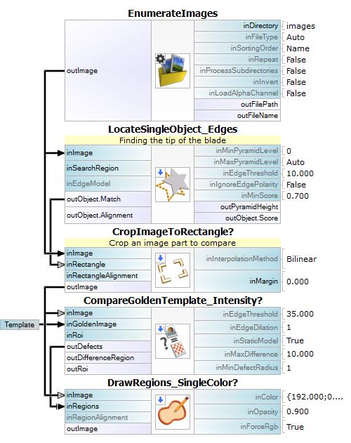 Iterate through images and save in a global parameter the output image of CropImageToRectangle which contains a not damaged blade. Name this parameter Template.