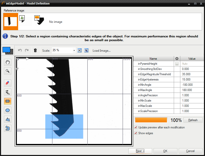 This example shows how to find defects at the end of a blade. Golden Template technique can be used to find even the smallest defect.