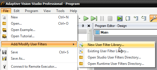 User filters are grouped in user filter libraries. Every user filter library is a single .dll file built using Microsoft Visual Studio. It can contain one or more filters that can be used in programs developed with Adaptive Vision Studio.
