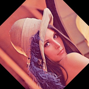 Result of applying output matrix of cvGetRotationMatrix2D with inCenter = (150, 150), inAngle = 45.0, inScale = 1 to sample image using cvWarpAffine. The cvWarpAffine filter was used with inDWidth = 300, inDHeight = 300 and inBorderMode = BORDER_CONSTANT.
