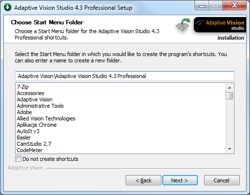 Choose if Adaptive Vision Studio should create a Start Menu shortcut.