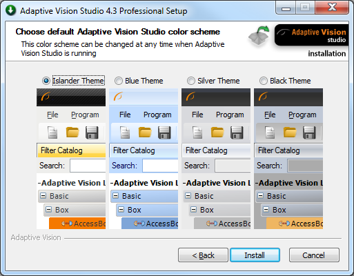 Adaptive Vision Studio supports 3 different color schemes. Choose one according to your personal preferences. You will be able to change it at any time.