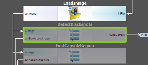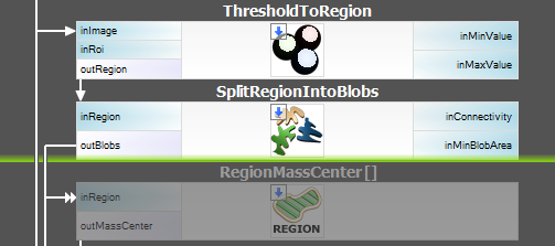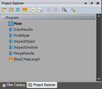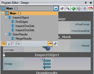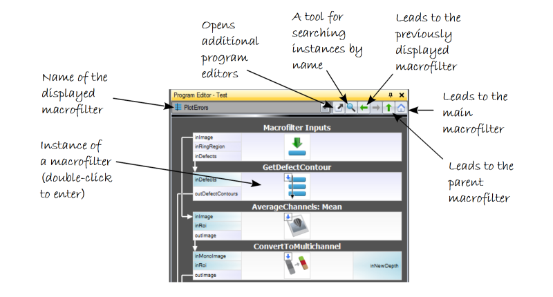 Except for the most simple applications, programs in Adaptive Vision Studio are composed of many so called macrofilters (subprograms). Instances of macrofilters in the Program Editor can be recognized through the icon which depicts several blue bars. Double clicking on an instance opens the macrofilter in the Program Editor.