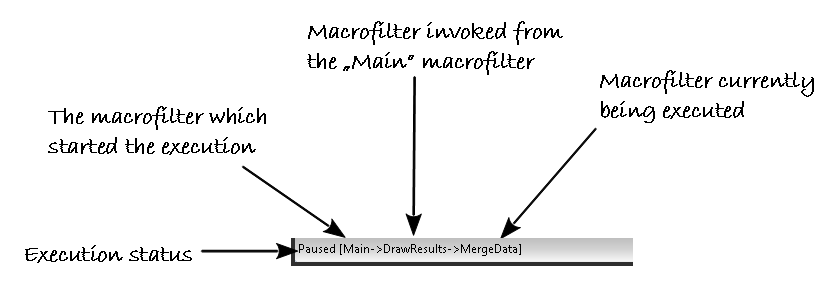 At each moment of a program execution you can see on the Application Status Bar which macrofilter instance is currently being executed. This is called a call-stack, because not only the name of the macrofilter is displayed, but also all the names of the parent macrofilters.
