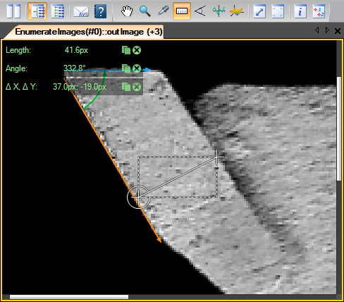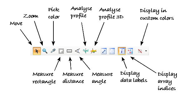 Data displayed in the Data Preview panels can be analyzed interactively. There are different tools for different types of data available in the main window toolbar. These tools depend on currently selected preview which is marked with a yellow border: