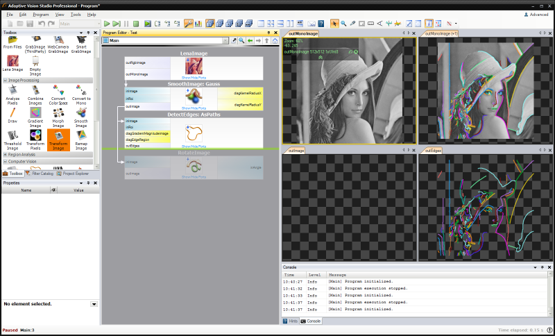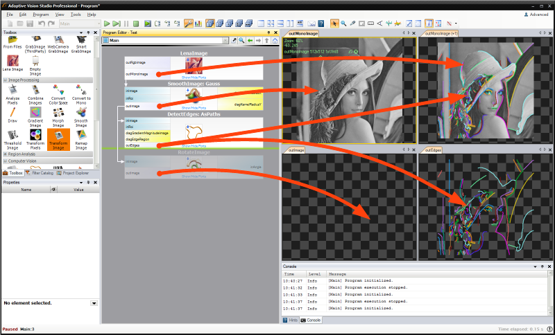 In bigger projects you will also find it useful to switch between three different layouts, which can be created to visualize different stages of the algorithm, as well as to the automatic layout mode, which is very useful for interactive analysis of individual filters: