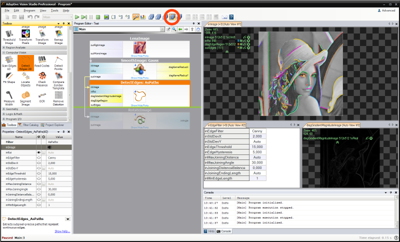 Once the filters are executed, their output data can be displayed in the Data Previews panels. To display a value of a particular output, just drag and drop from the port of the filter to a Data Preview panel. As you can see in the picture below, multiple data can be often displayed in multiple layers of a single preview. This is useful especially for displaying geometrical primitives over images.
