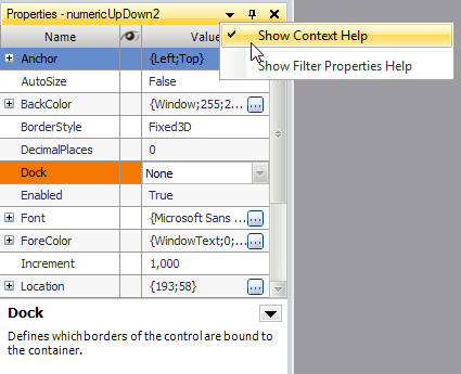Note: Make sure that Context Help is visible to quickly access a short description of each property:
