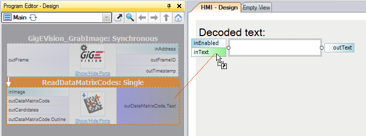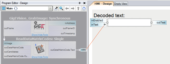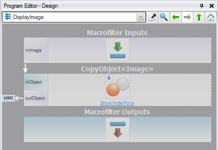 Each input of an HMI control can only have one source of data in the program. However, sometimes it is required that values to that control are sent from several different places. For example, a VideoBox display can be connected with the output of a GigEVision_GrabImage filter, but we might also want to send an empty image to that control when an error occurs. This can be achieved by creating a macrofilter with one or several inputs and with the same number of CopyObject filters connected with the HMI (direct connections from macrofilter inputs to the HMI are not permitted). That macrofilter can then be then used in many times in the program, effectively allowing for explicit communication with the HMI from multiple places.