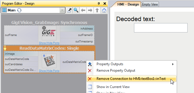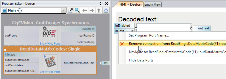 If we need to remove a connection between a filter and an HMI control, we can right-click the label of either the input or the output. The context menu will include an option to remove the connection.