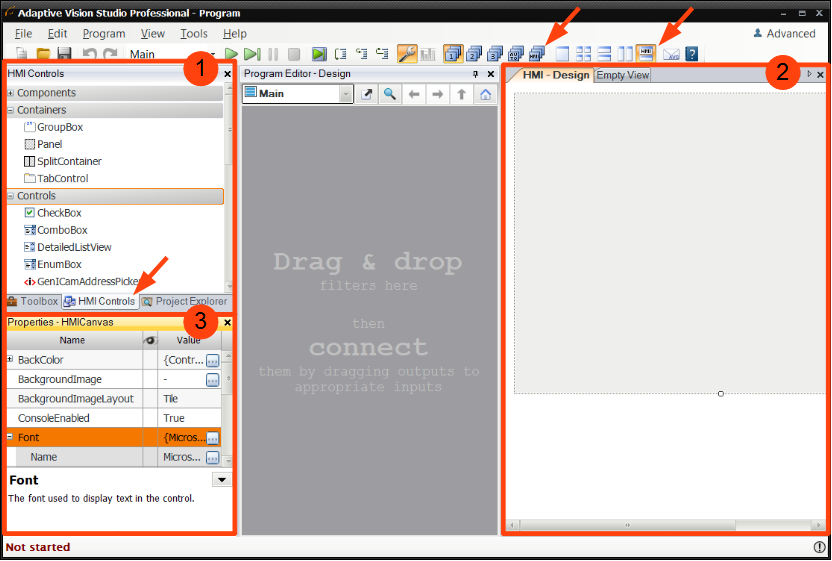 The building blocks of a user interface are called controls. These are graphical components such as buttons, check-boxes, image previews or numeric indicators. The user can design a layout of an HMI in an arbitrary way by selecting controls from the HMI Controls window and by placing them on the HMI Canvas. The Properties window will be used to customize such elements as color, font face or displayed text. There are also some controls, called containers, which can contain other controls in a hierarchical way. For example, a TabControl can have several tabs, each of which can contain a different set of other controls. It can be used to build highly sophisticated interfaces.