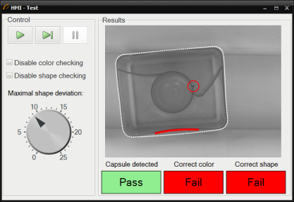 The HMI Designer in Adaptive Vision Studio is designed for very easy creation of custom user interfaces which resemble physical control panels (a.k.a. front panels). With such an interface the end user will able to control execution process, set inspection parameters and observe visualization results. There are also more advanced features for protecting the HMI with passwords, saving its state to a file, creating multi-screen interfaces or even for allowing the end user to create object models or measurement primitives.