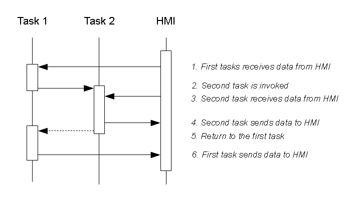 Sample communication structure when one task is nested in another. Please note, that Task 2 will often operate in a loop making it very long before Task 1 sends data to the HMI.