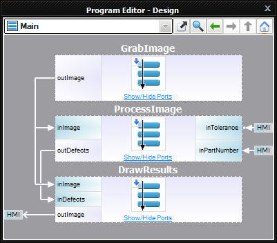 - Keep the program structure simple and clear. For most applications there should be a single loop consisting of three parts: (1) image acquisition, (2) image processing, (3) preparing data for the hmi. We recommend that all connections with HMI are created on the top level of the main loop as can be seen on the picture below: