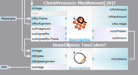 Adaptive Vision Studio will assist this process, by disallowing connections between incompatible ports. After the connection is made, the input or output label will include a little plug icon, and the connected filter will have an "HMI" label next to its input or output.
