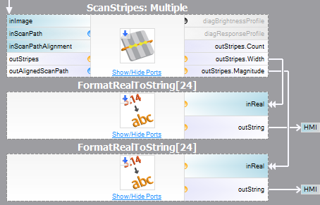 The ScanMultipleStripes filter has an output named outStripes.Width and outStripes.Magnitude, which are of RealArray type. We want to display these numbers in the HMI with a DetailedListView control, which has several inputs of StringArray type.