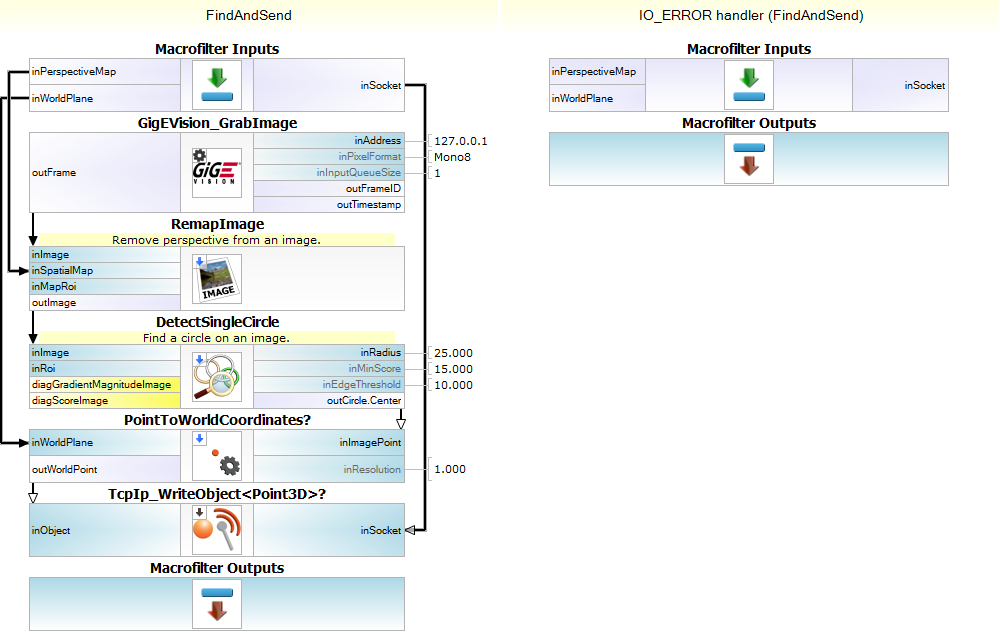 Macrofilter FindAndSend – macrofilter finds a circle on an image and then converts its coordinates to world coordinates. At the end the results are sent to the external device.