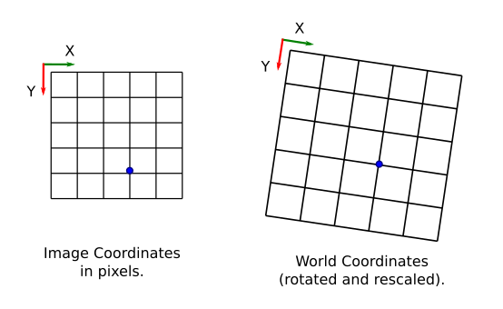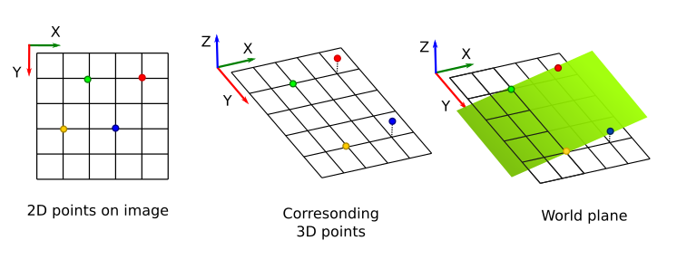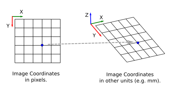 Image coordinates are denoted in pixels, with the origin point (0, 0) corresponding always to the top-left corner of the image. On the other hand world coordinates are denoted in real-world units, like millimeters, with the origin point placed at arbitrary location. Moreover, world coordinates can be three-dimensional and the plane of interest can be visible with perspective distortion. The task is to find the correspondence between the image and the world coordinates, and translate between ones and another.