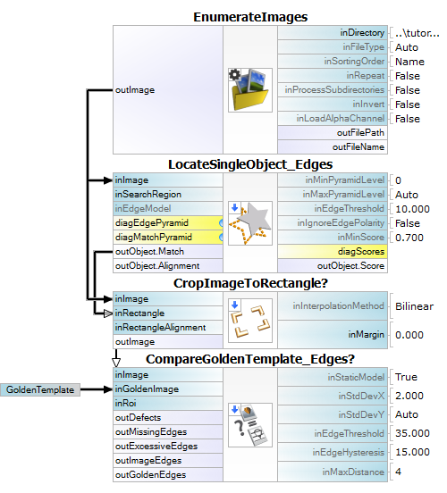 Comparison based on objects edges - this method is very useful when defects may occur on the edge of the object and pixel comparison may fail due to different light reflections or the checking the object surface is not necessary. For matching object's edges use the CompareGoldenTemplate_Edges filter.