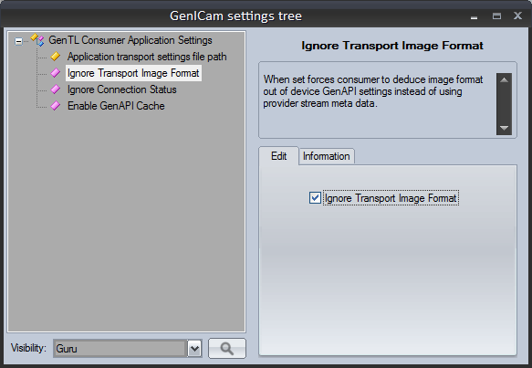 On devices with early version of the firmware, there are problems with starting image acquisition. The workaround is simple: just set the IgnoreTransportImageFormat setting to "yes". This option is available in the GenICam Device Manager (Tools → Application Settings...):