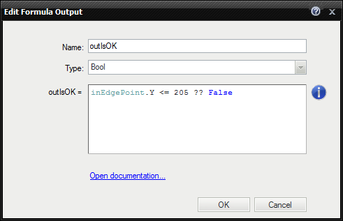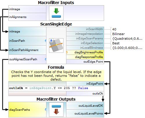 Add an outIsOK output (Bool) to this formula with expression "inEdgePoint.Y <= 205 ?? False". The "??" operator specifies what value should be used when the edge point is not detected (Nil).