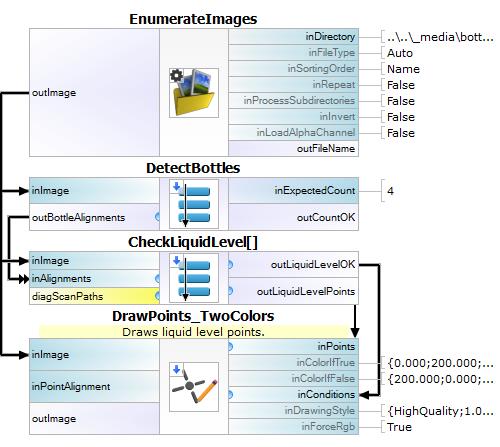 Extract another macrofilter, "CheckLiquidLevel", which takes an image and an alignment on the inputs, and returns the liquid level point and status (ok/not ok). Accept the suggested transformation when using the "Extract Step..." command to assure, that the entire macrofilter is executed multiple times - once for each bottle (as opposed to executing it once for the entire array of bottles).