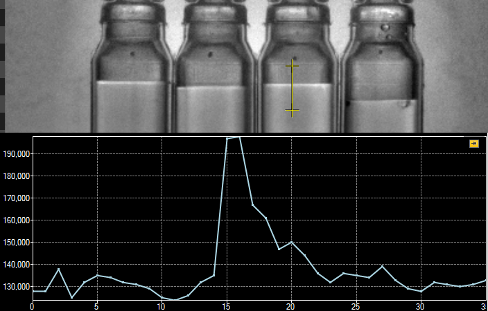 As we can see in the profile, there is a peak that represents a bright border between the liquid and the empty part of a bottle. (Note that this might be counter-intuitive, but the liquid is actually not much brighter than the empty space above it). This peak in the profile starts with a dark-to-bright transition, or a raising edge. To find this edge we use a ScanSingleEdge filter.