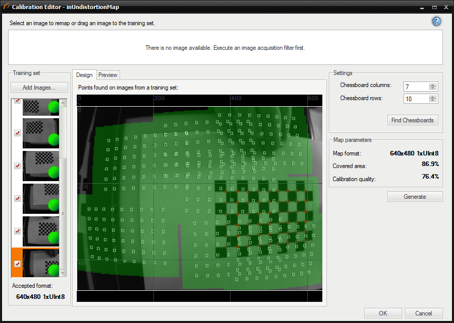 - Using DetectChessboardGrid, CalibrateCamera and CreateUndistortionMap filters.