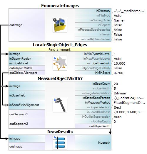 To measure objects width ready-to-use tool MeasureObjectWidth. This filter uses 1D Edge Detection technique to measure width. Tool works like ScanSingleStripe filter but is prepared for most commonly used tasks.
