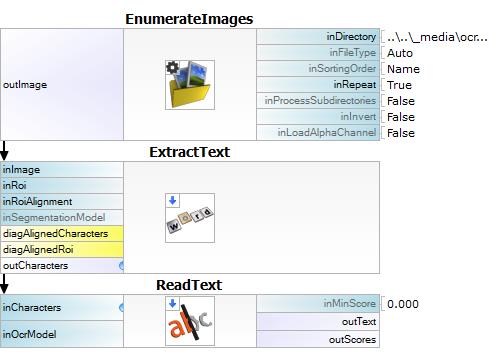 To perform most of the OCR applications two filters are needed. Extracting text from the image can be done using the ExtractText filter. To get textual values from regions the ReadText filter can be used. Both of these filters has a specialized GUI editor which is a convenient way to perform the text reading.
