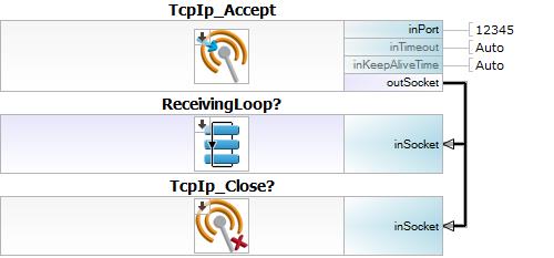 Drag a connection from TcpIp_Accept.outSocket over the instance of the ReceivingLoop macrofilter to create a new input and a connection. Change the input type from "SocketId?" to "SocketId", so that the entire macrofilter is not executed if the connection is not successful.