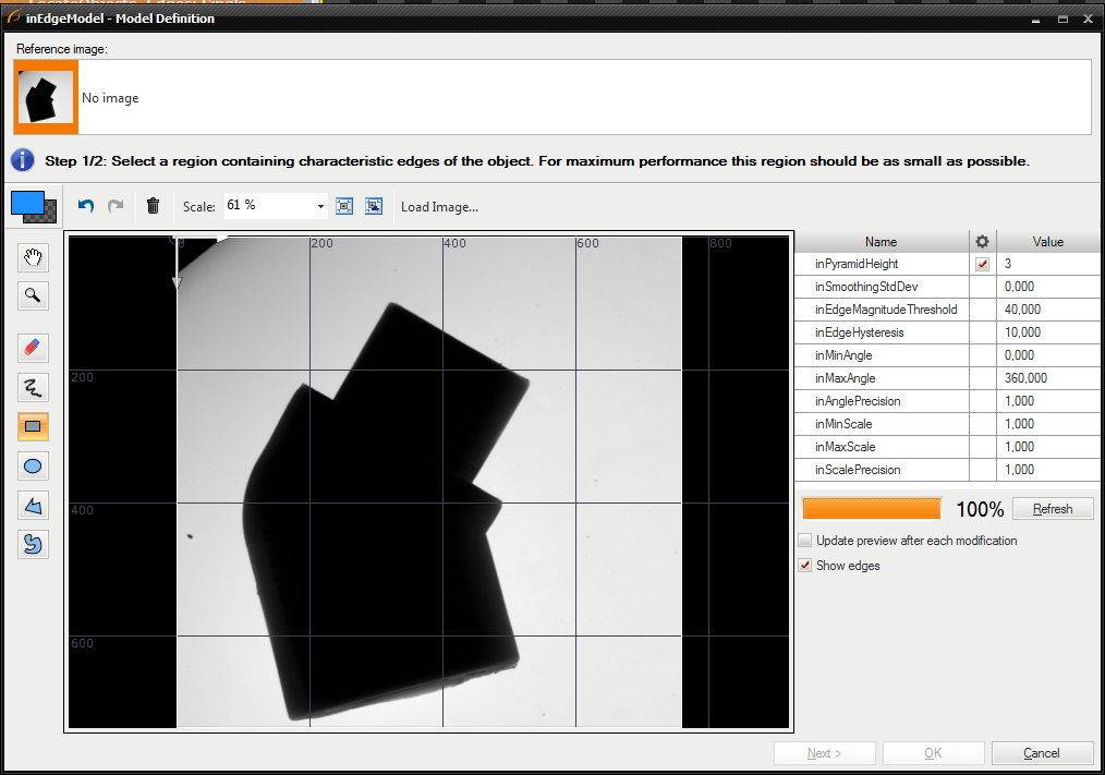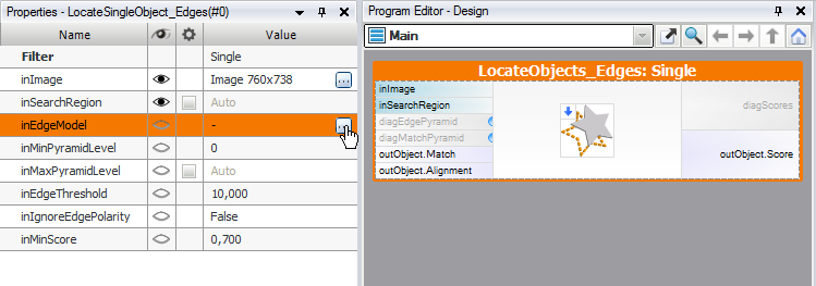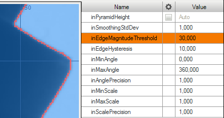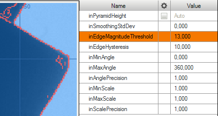 - Edge-base matching only: Set the inSmoothingStdDev, inEdgeMagnitudeThreshold and inEdgeHysteresis parameters to values that result in the best quality of the found edges.