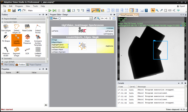 When the model is ready, performing template matching in an application is straightforward – after connecting the filters and setting the matching parameters, the results are on the outputs of the LocateSingleObject_Edges filter (or similar):