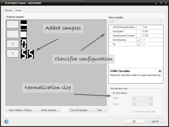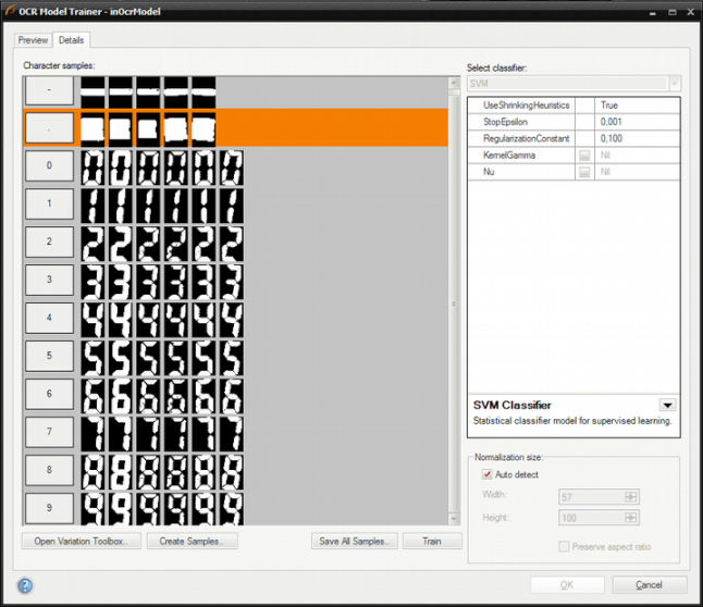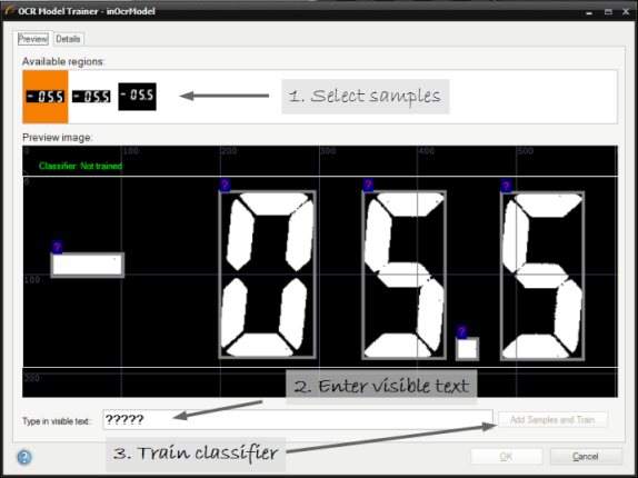 Text recognition editor creates an OCR model for getting text from regions. More details about the OCR technique can be found in Machine Vision Guide: Optical Character Recognition.