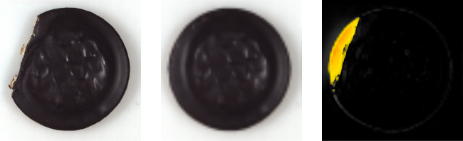 From left to right: An input image, corresponding "correct image" predicted by network and corresponding heatmap of defects