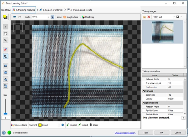 The most important task for the user is to prepare defects/class masks and choose an appropriate feature size before training. A defects (class) mask contains pixels indicating which regions of the input image represent a given feature.