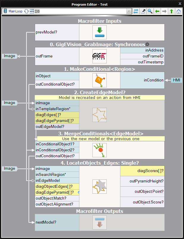Please note that the use of CreateGrayModel and CreateEdgeModel filters will only be necessary in more advanced applications. Otherwise it is enough to use a single filter of the Matching step and create the model by setting the inGrayModel or inEdgeModel parameter of the filter.