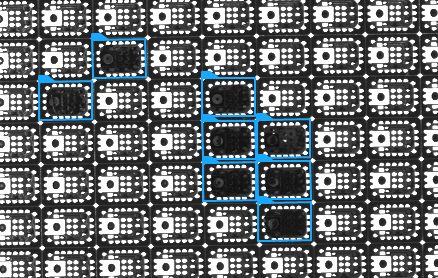 Locating multiple objects with the gray-based method (inMaxPyramidLevel = 2). Please note, that the edge-based method might not work properly here, because what we are looking for (a missing chip) is a sub-object of what we are not looking for (a correct chip).