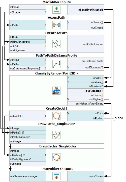 The task of macrofilters FindCapsuleRegion and FindCapsuleShape was to extract the contour of the capsule. The next step is to create Step macrofilter DetectDeformations. In this filter you will computing the distance between outShapeOrNothing path and the model path. If the distance is higher than specified, the capsule is damaged.