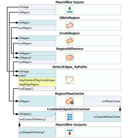 Create Step macrofilter FindCapsuleShape and create inputs of types Image and Region. Connect the input of type Region with outRegionOrNothing. This macrofilter is responsible for finding the contour of the capsule.