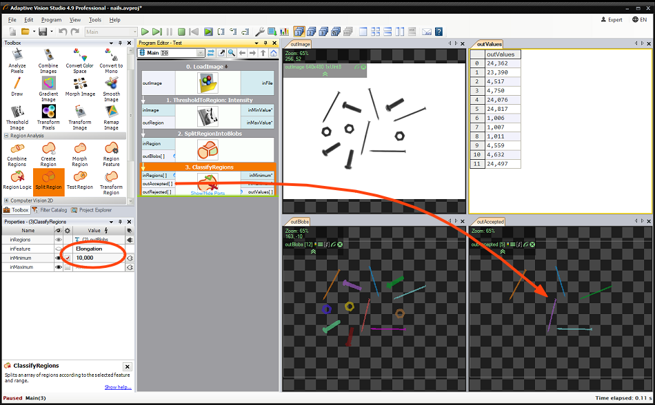 At this stage what we have is an array of regions. This array has 12 elements, of which 4 are nails. To separate the nails from other objects, we can use the fact that they are longer and thinner. The ClassifyRegions filter (Region Analysis → Region Logic) with inFeature input set to Elongation and inMinimum set to 10 will return only the nails on its outAccepted output: